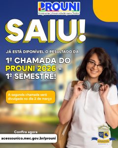 Foi publicada nesta terça-feira, 03 de fevereiro, a primeira chamada do Programa Universidade para Todos (PROUNI) 2026/1. Os candidatos pré-selecionados deverão comparecer à Faculdade Metropolitana – UNNESA, à qual se candidataram, no período de 03 a 13 de fevereiro de 2026, para realizar a comprovação das informações prestadas no ato da inscrição, conforme determina o edital do programa.
