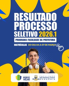 A Faculdade Metropolitana de Rondônia informa que já está disponível o Resultado Definitivo do Processo Seletivo 2026.1 do Programa Faculdade da Prefeitura, iniciativa da Prefeitura de Porto Velho que concede bolsas integrais para cursos de graduação em instituições de ensino superior parceiras.