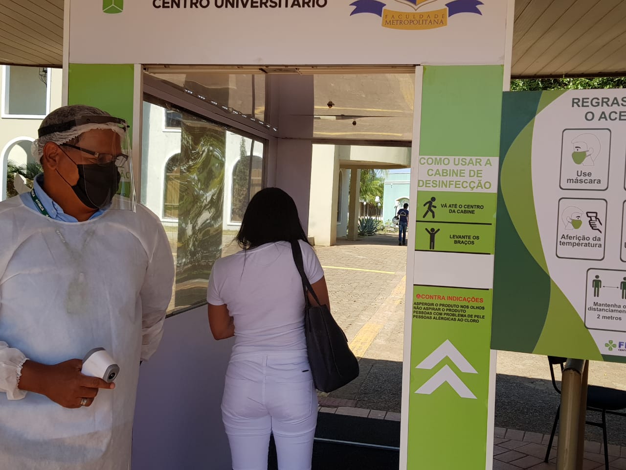 Mesmo como os números de infectados pelo novo coronavírus diminuindo na capital, os cuidados precisam continuar sendo tomados, hoje todas as pessoas que chegam na Faculdade Metropolitana tem sua temperatura medida logo na chegada, o uso do álcool em gel é feito nas mãos e o uso de mascará é obrigatório, todos também passam por uma cabine de desinfecção.