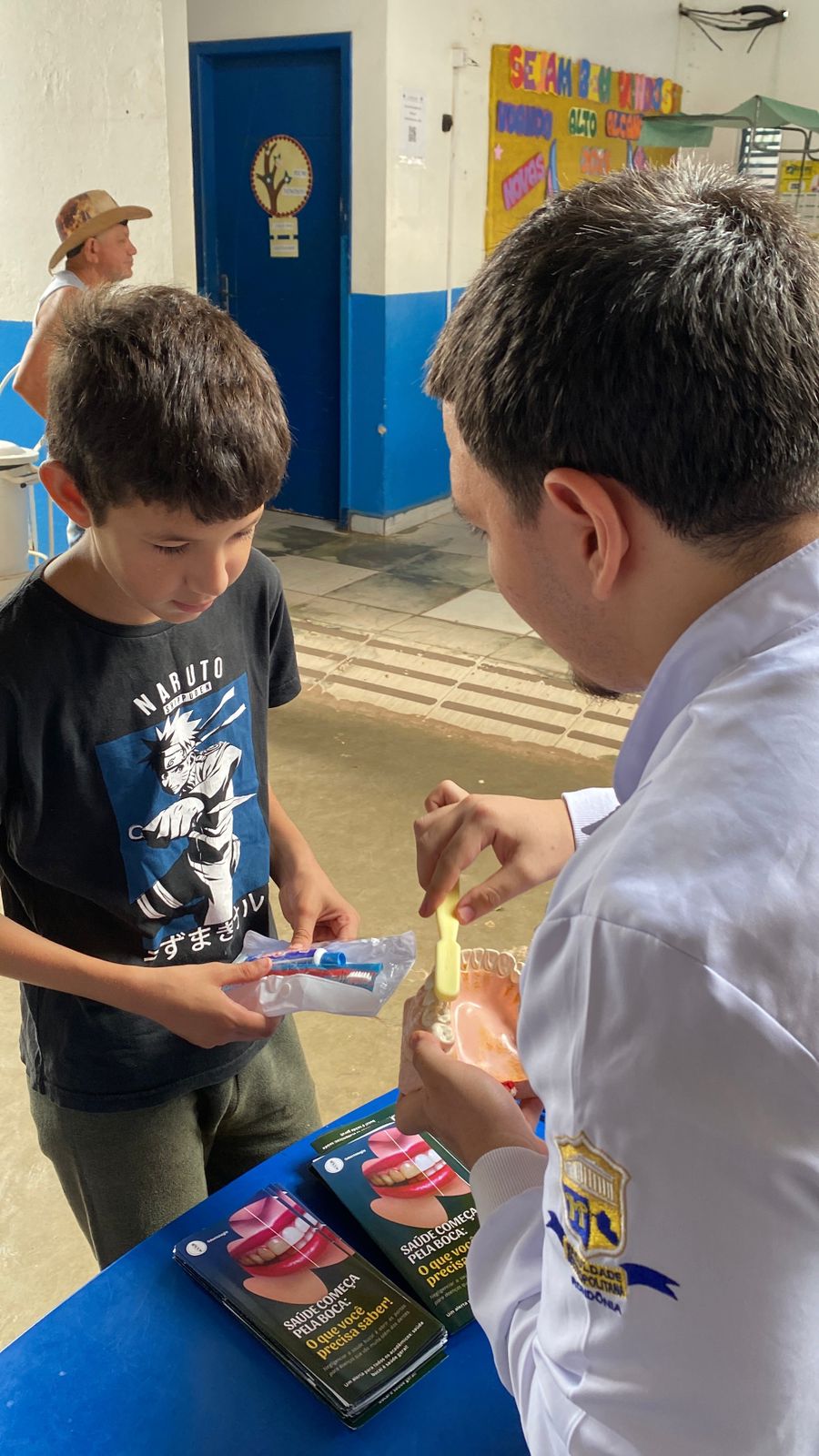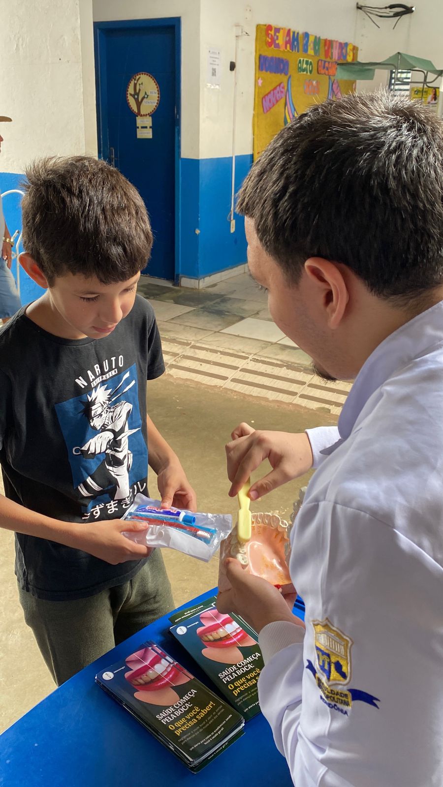 Durante a ação, os acadêmicos de Odontologia realizaram orientações sobre escovação e cuidados com a saúde bucal, além de distribuírem kits de higiene bucal infantil às famílias presentes. Já os estudantes de Administração da FIMCA EAD ofereceram aconselhamento financeiro, auxiliando a população com informações práticas sobre organização de gastos e planejamento doméstico.