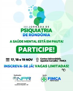 O Núcleo de Psiquiatria de Rondônia, filiado à Associação Brasileira de Psiquiatria (ABP), realiza entre os dias 17 e 19 de novembro a III Jornada de Psiquiatria de Rondônia, no campus do Centro Universitário Aparício Carvalho – FIMCA e da Faculdade Metropolitana de Rondônia, em Porto Velho (RO).
