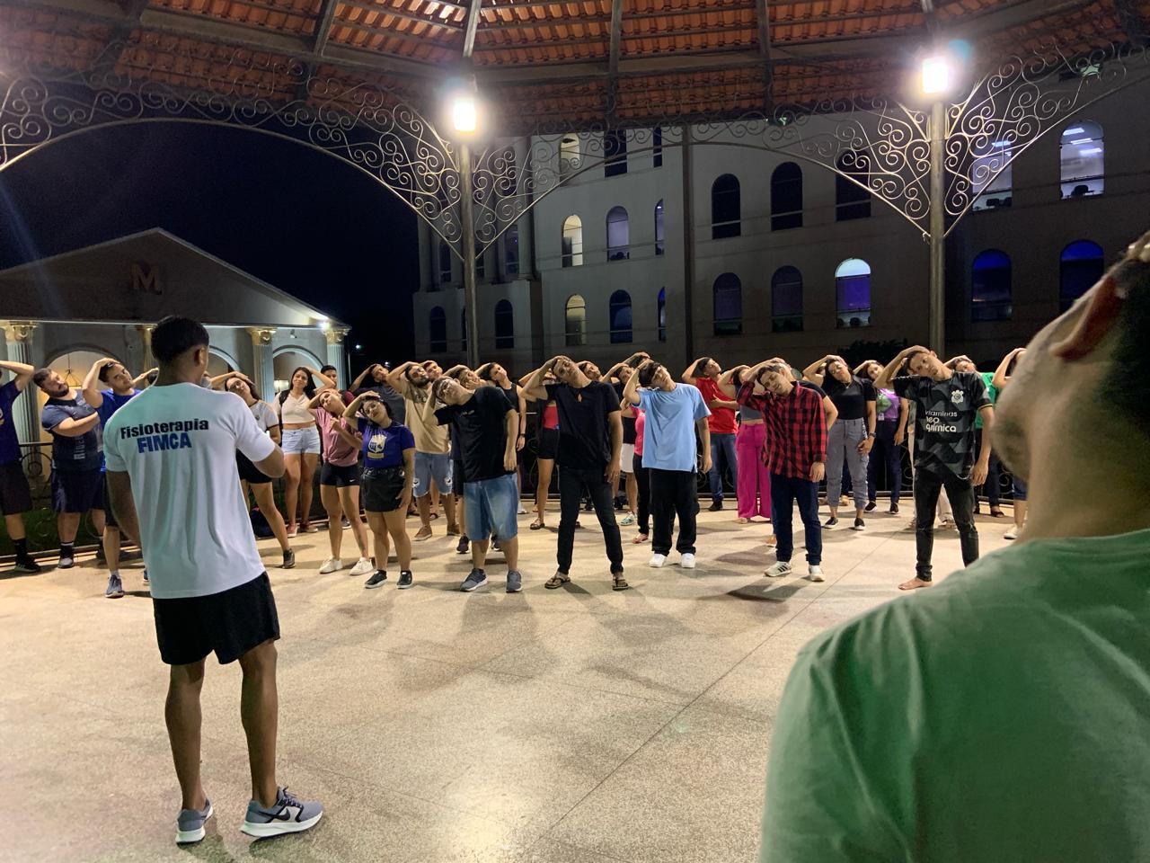 Já no coreto do campus, os cursos de Fisioterapia e Educação Física reuniram-se para um alongamento seguido de uma animada aula de fit dance para as acadêmicas, acadêmicos e colaboradoras presentes, encerrando a noite com sucesso e muita animação.