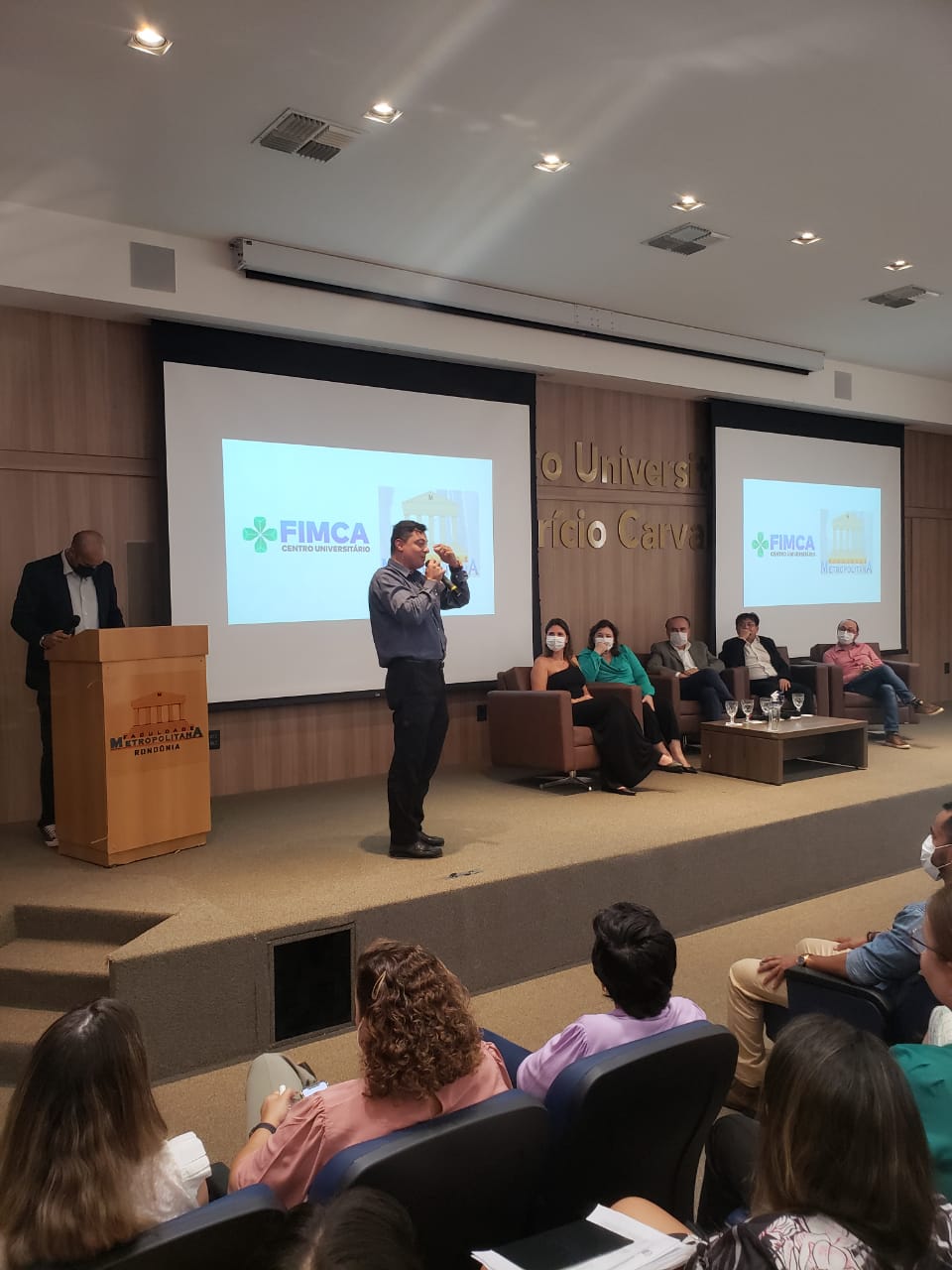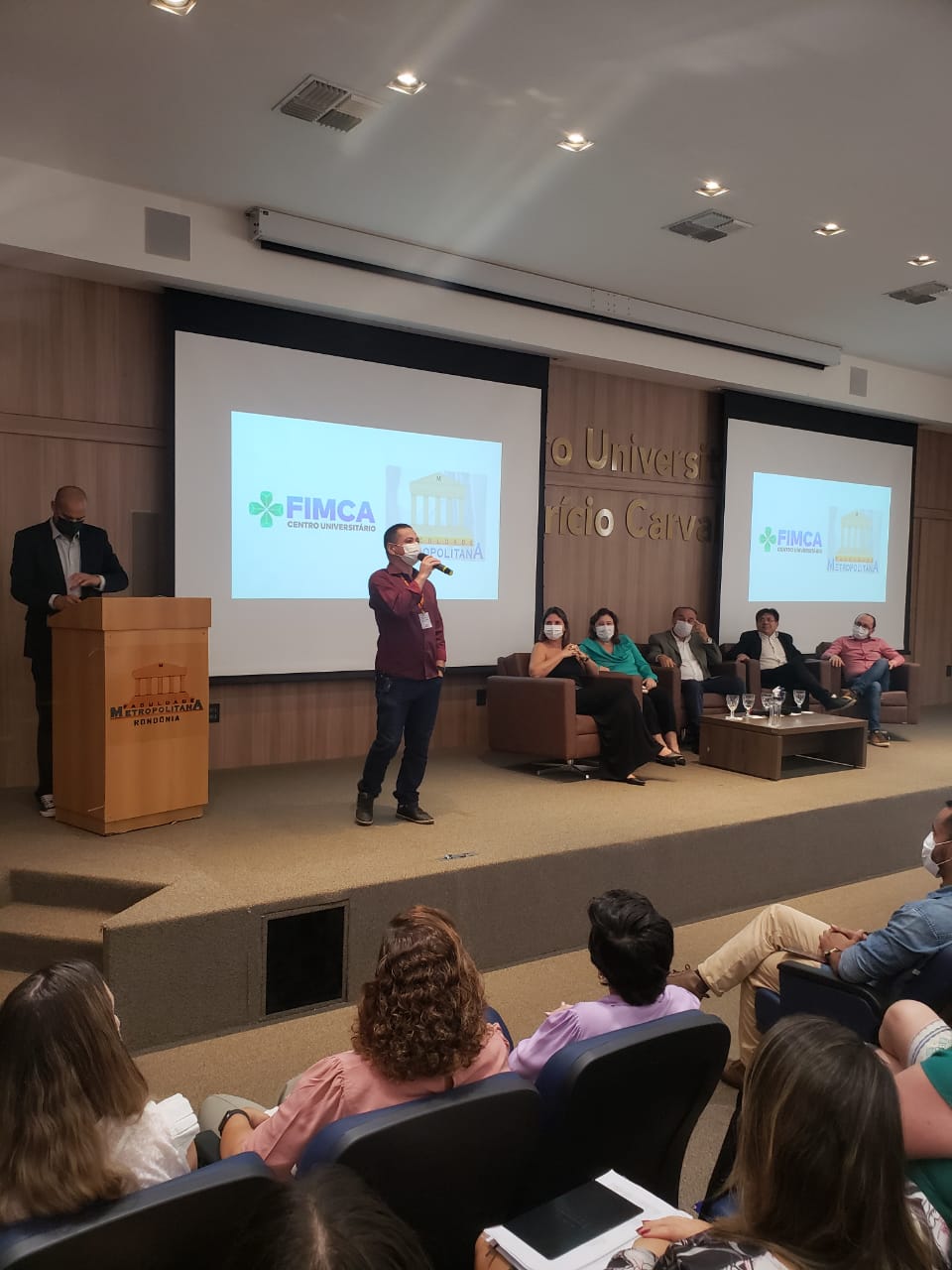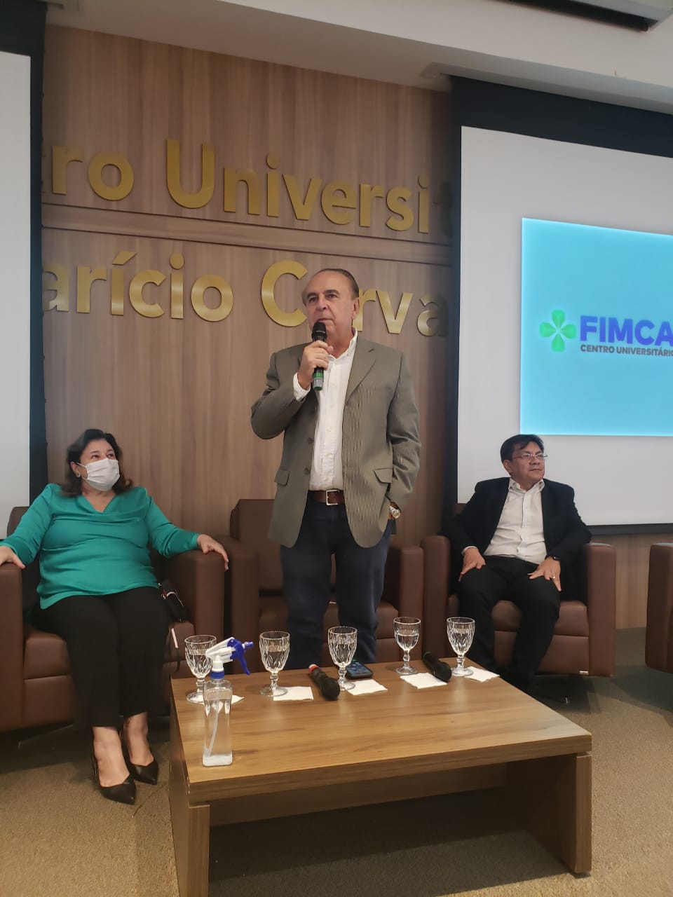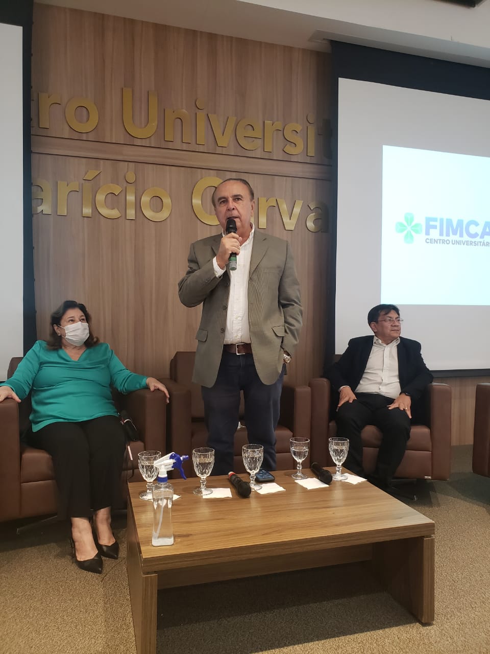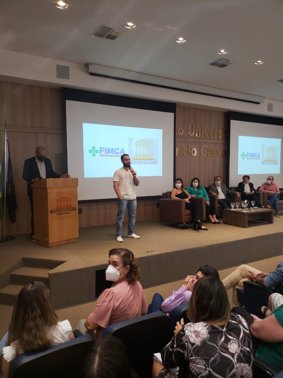 O Diretor Pedagógico Edimar Sartoro começou com a palavra, contando um pouco da história da FIMCA. Em seguida, falou o professor Luiz Ibanor, falando da qualidade dos nossos cursos e que temos os melhores professores, além da nota máxima conferida pelo MEC. A Diretora Acadêmica Dra. Nelice Batistelli expôs a importância da dedicação do acadêmico. Que de nada vai adiantar a melhor estrutura e os melhores docentes, se o aluno não fizer sua parte. A Dra. Maria Silvia relembrou o início da instituição, em 1998, e falou da emoção de ver o quanto cresceu. O Dr. Aparício Carvalho deu as boas-vindas aos calouros, ressaltando que terão a melhor estrutura, os melhores professores, e uma instituição empenhada em oferecer o melhor aos novos acadêmicos.