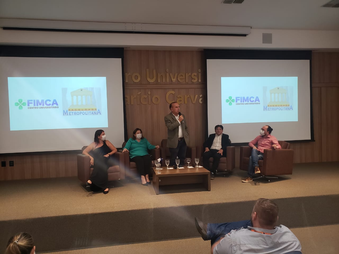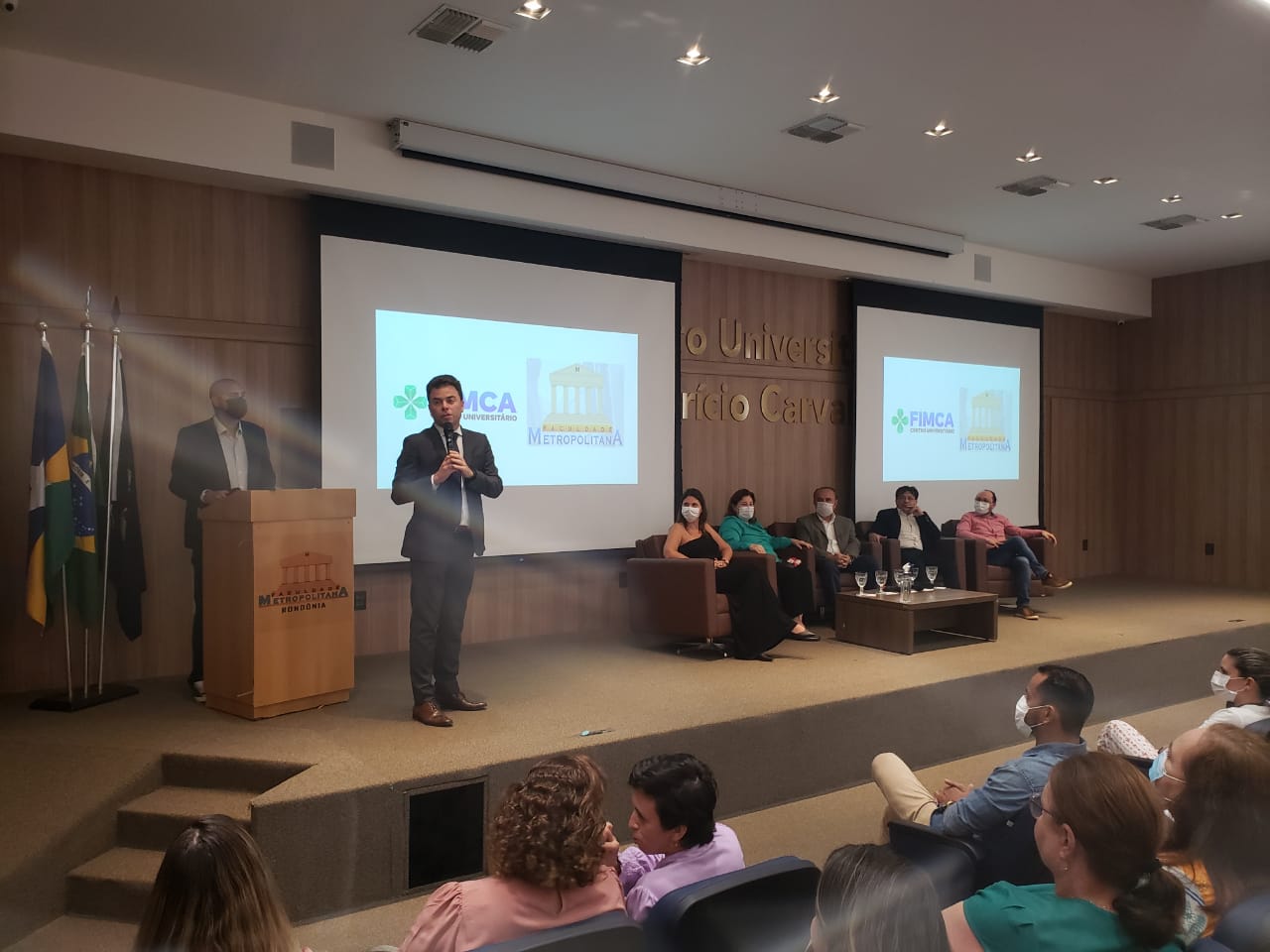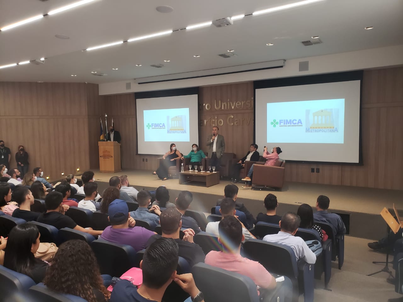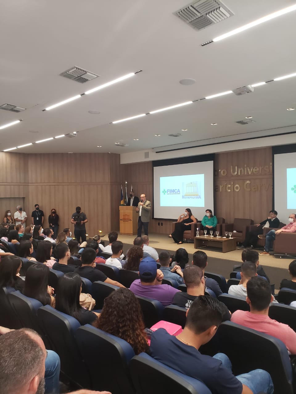 O Diretor Pedagógico Edimar Sartoro começou com a palavra, contando um pouco da história da FIMCA. Em seguida, falou o professor Luiz Ibanor, falando da qualidade dos nossos cursos e que temos os melhores professores, além da nota máxima conferida pelo MEC. A Diretora Acadêmica Dra. Nelice Batistelli expôs a importância da dedicação do acadêmico. Que de nada vai adiantar a melhor estrutura e os melhores docentes, se o aluno não fizer sua parte. A Dra. Maria Silvia relembrou o início da instituição, em 1998, e falou da emoção de ver o quanto cresceu. O Dr. Aparício Carvalho deu as boas-vindas aos calouros, ressaltando que terão a melhor estrutura, os melhores professores, e uma instituição empenhada em oferecer o melhor aos novos acadêmicos.