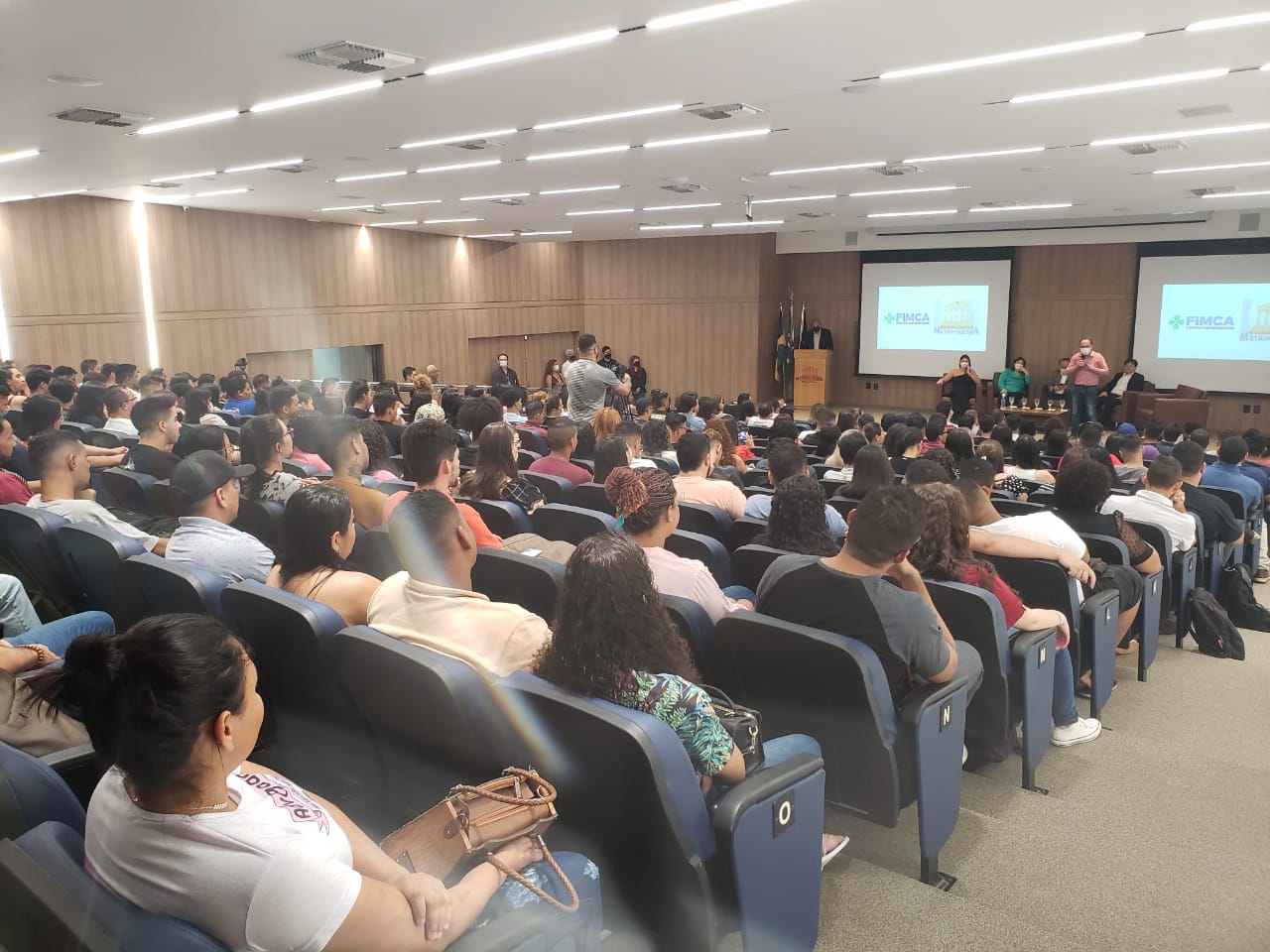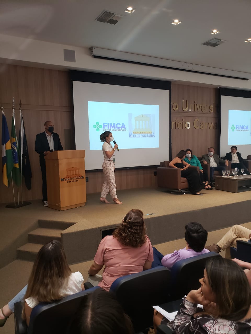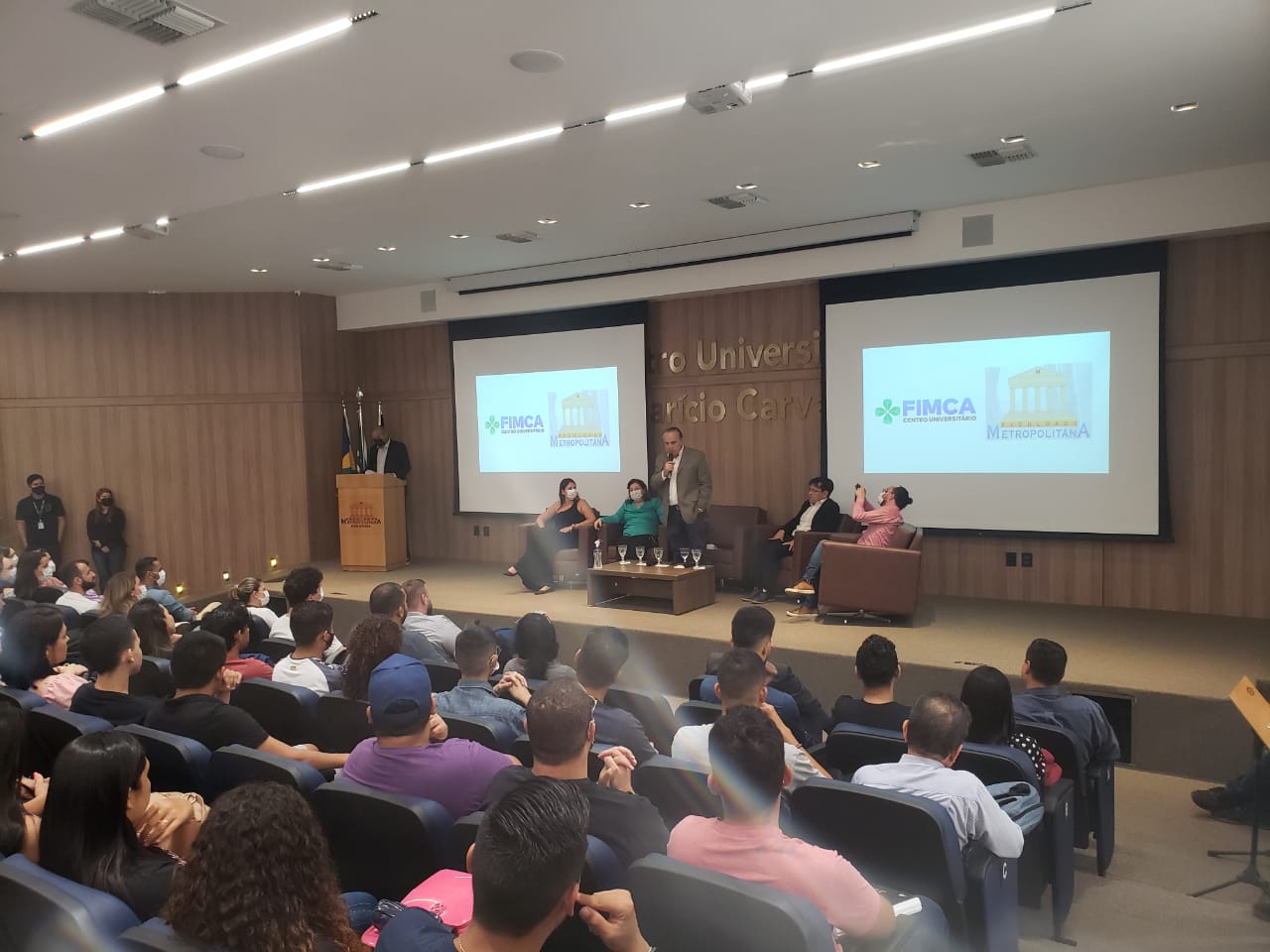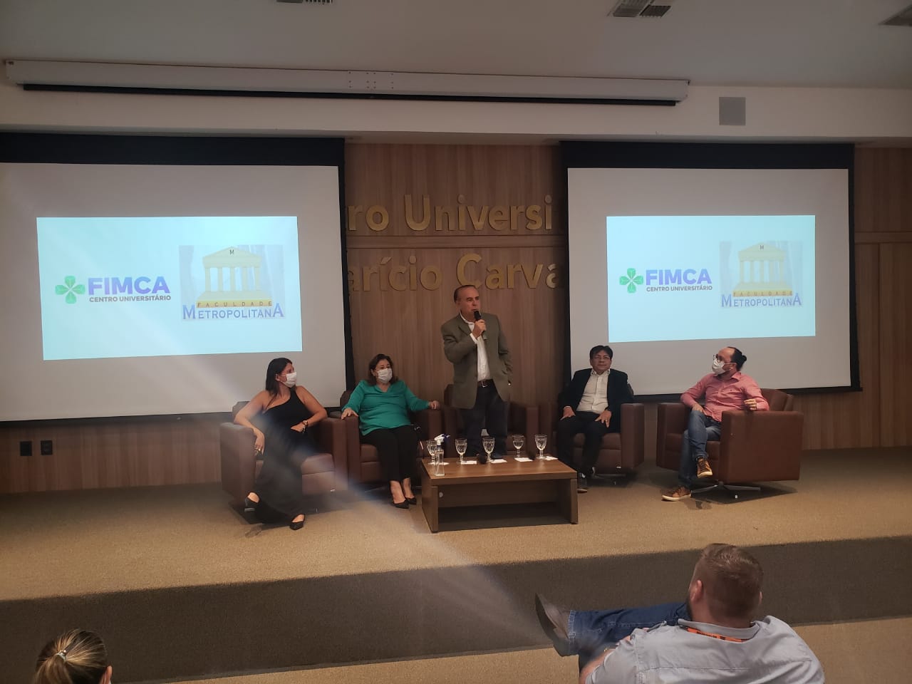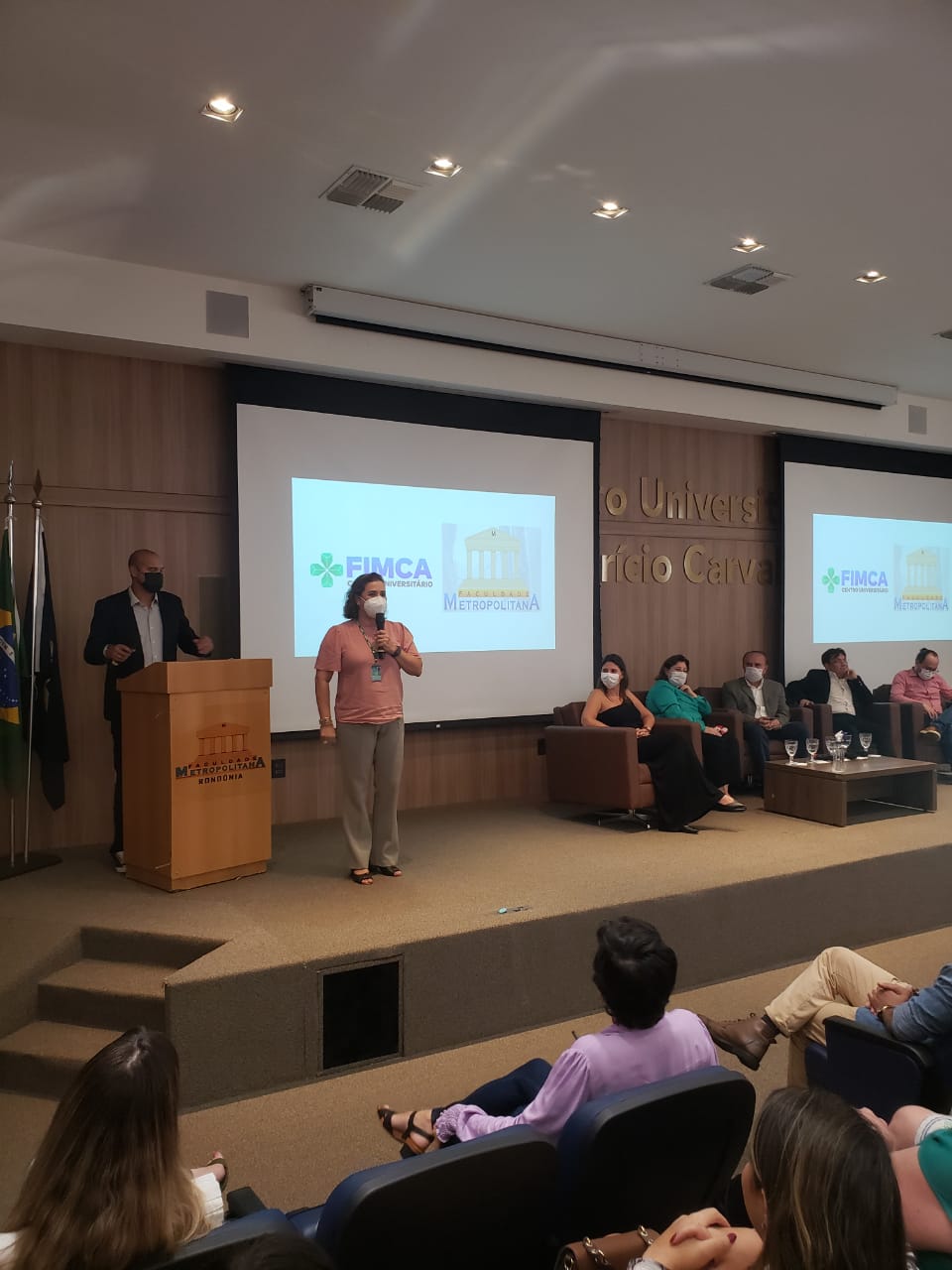 O Diretor Pedagógico Edimar Sartoro começou com a palavra, contando um pouco da história da FIMCA. Em seguida, falou o professor Luiz Ibanor, falando da qualidade dos nossos cursos e que temos os melhores professores, além da nota máxima conferida pelo MEC. A Diretora Acadêmica Dra. Nelice Batistelli expôs a importância da dedicação do acadêmico. Que de nada vai adiantar a melhor estrutura e os melhores docentes, se o aluno não fizer sua parte. A Dra. Maria Silvia relembrou o início da instituição, em 1998, e falou da emoção de ver o quanto cresceu. O Dr. Aparício Carvalho deu as boas-vindas aos calouros, ressaltando que terão a melhor estrutura, os melhores professores, e uma instituição empenhada em oferecer o melhor aos novos acadêmicos.