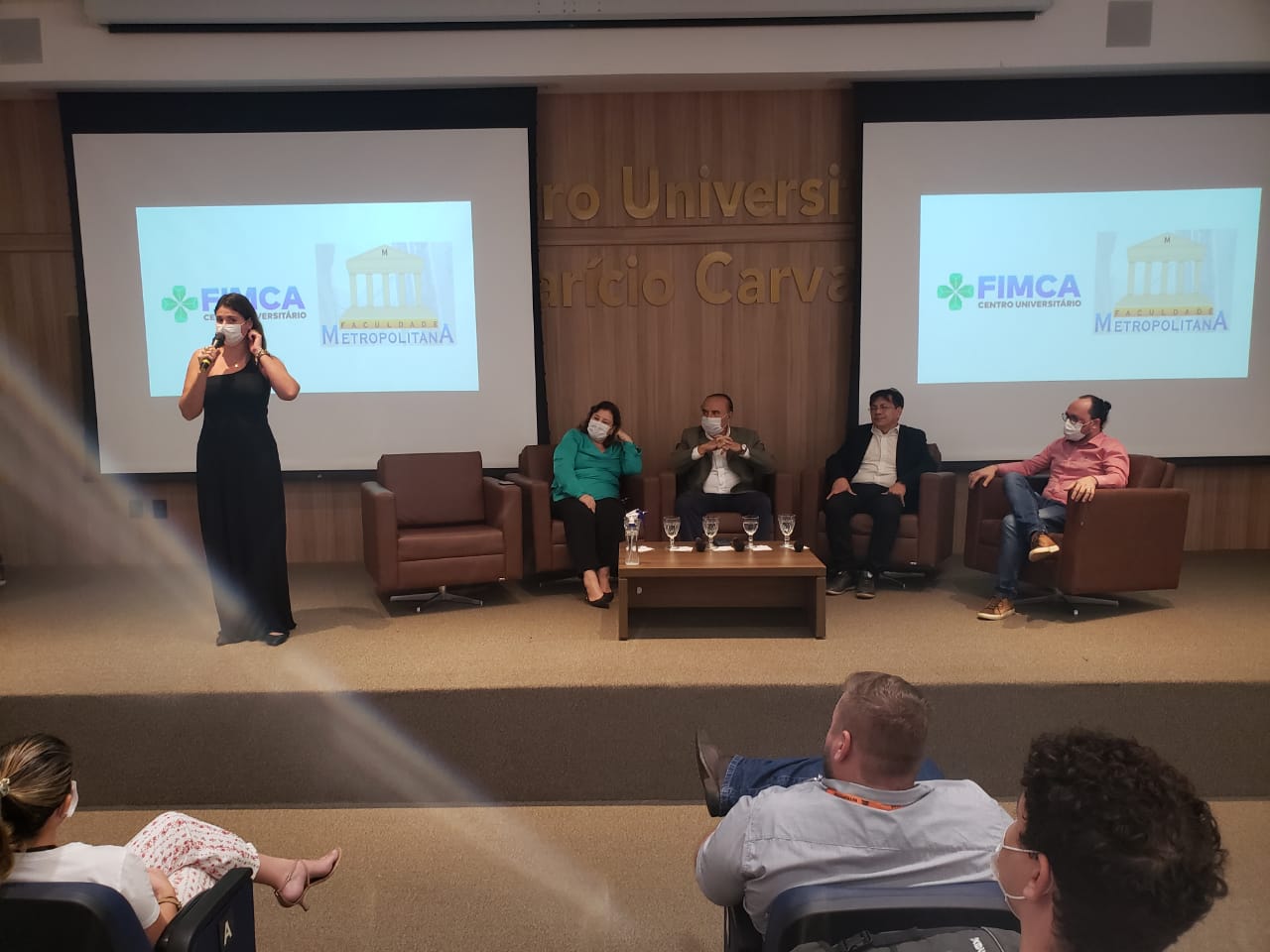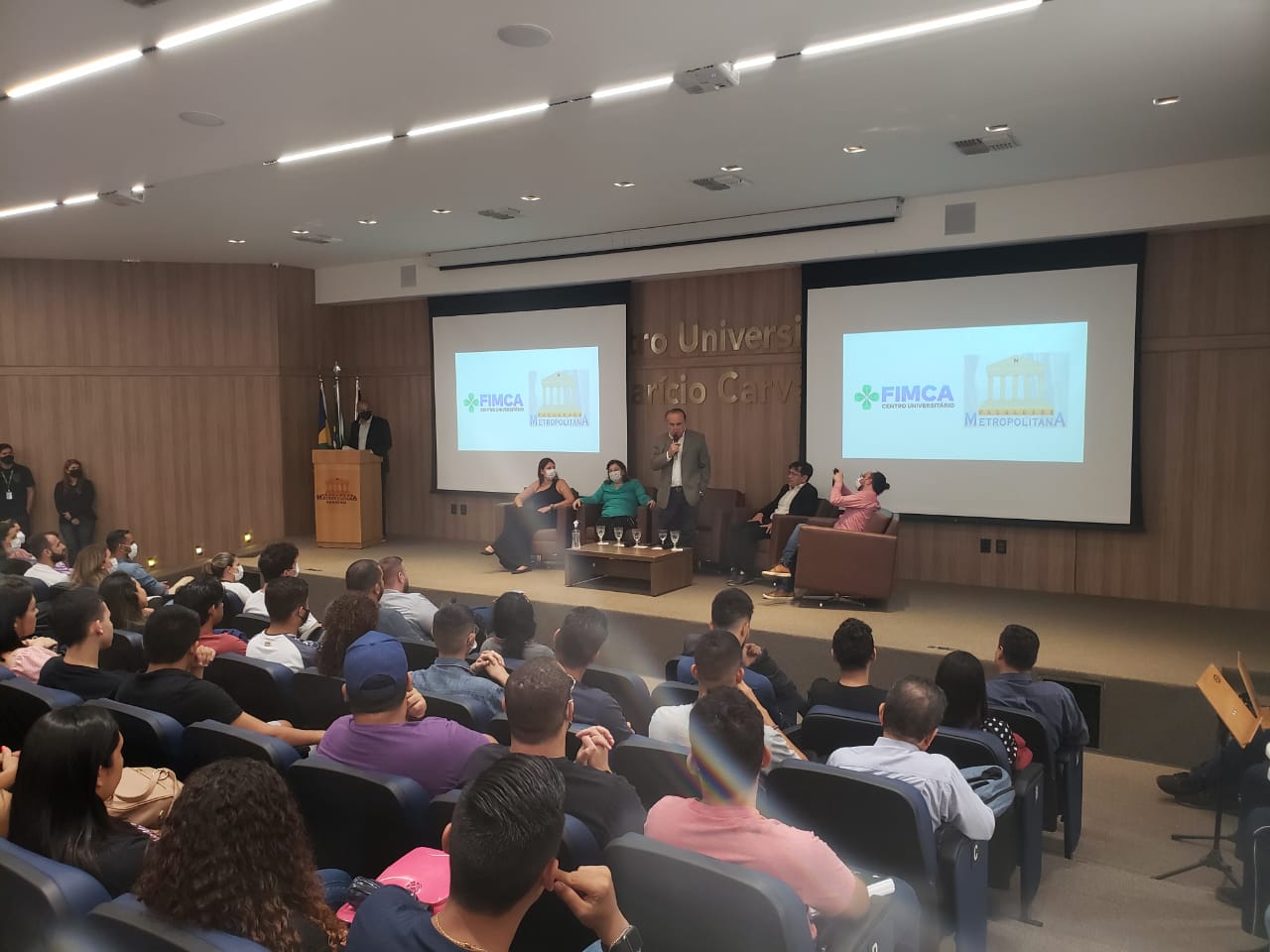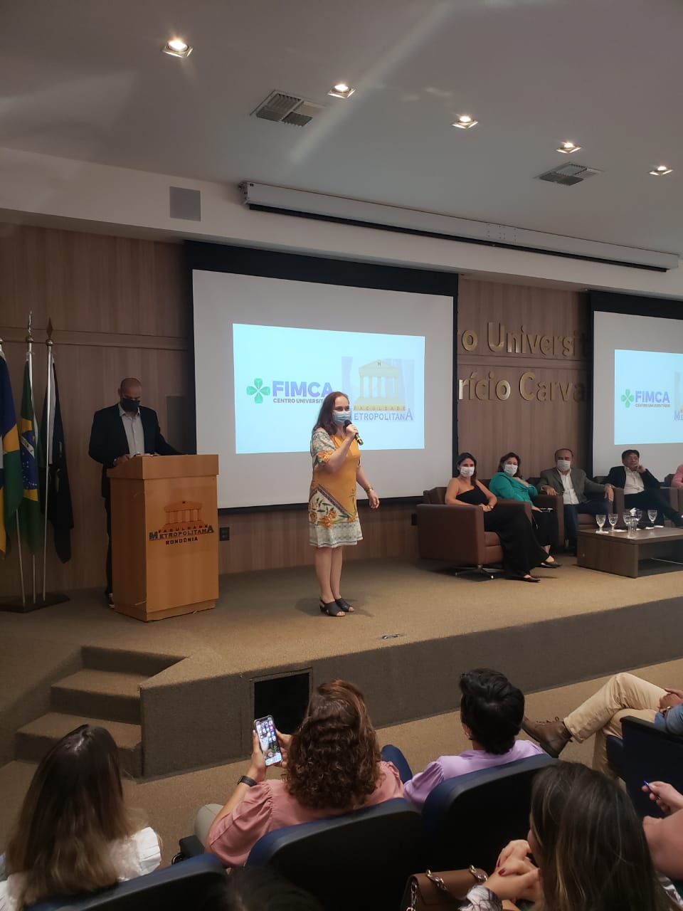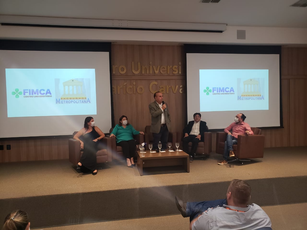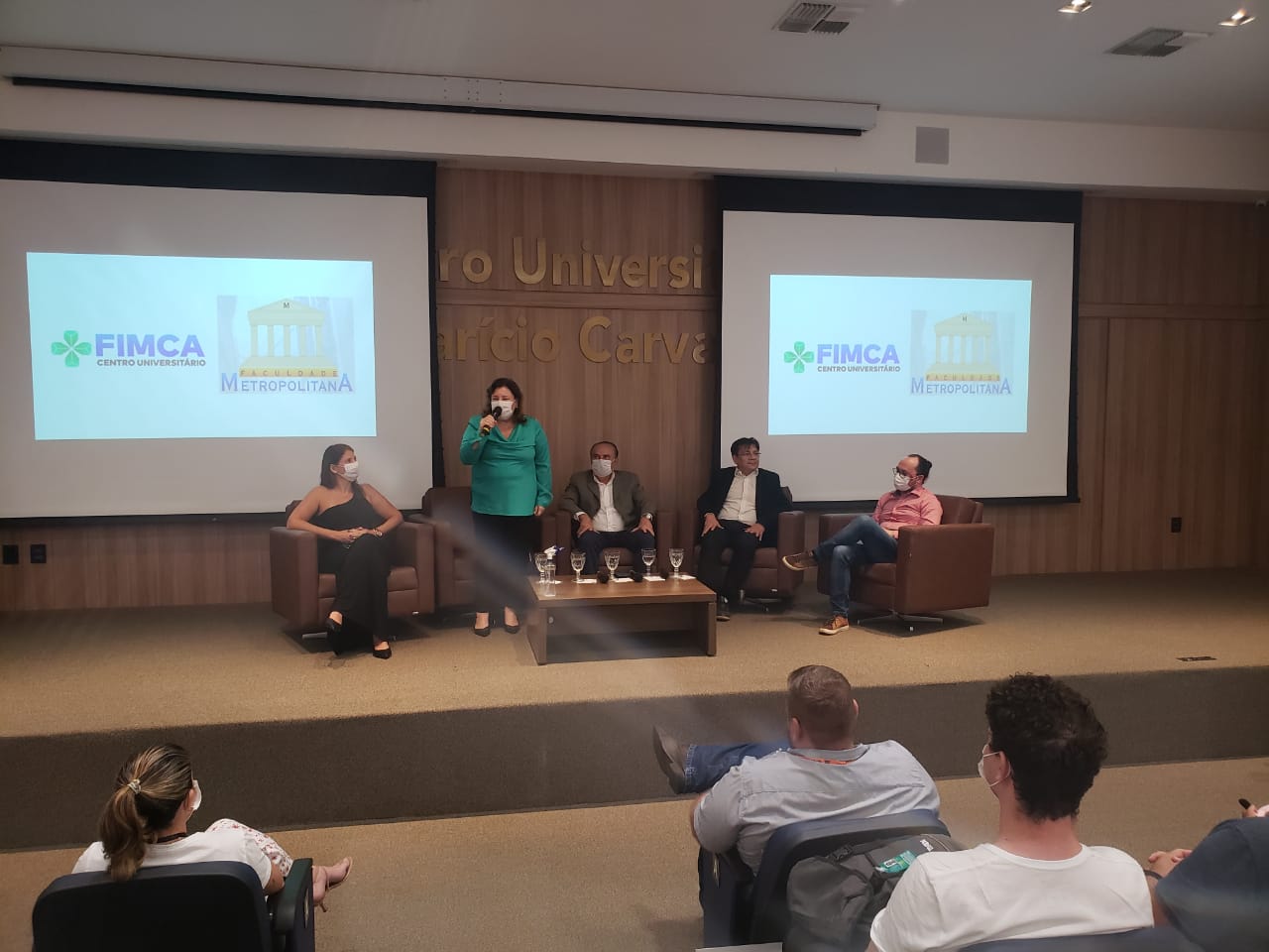 O Diretor Pedagógico Edimar Sartoro começou com a palavra, contando um pouco da história da FIMCA. Em seguida, falou o professor Luiz Ibanor, falando da qualidade dos nossos cursos e que temos os melhores professores, além da nota máxima conferida pelo MEC. A Diretora Acadêmica Dra. Nelice Batistelli expôs a importância da dedicação do acadêmico. Que de nada vai adiantar a melhor estrutura e os melhores docentes, se o aluno não fizer sua parte. A Dra. Maria Silvia relembrou o início da instituição, em 1998, e falou da emoção de ver o quanto cresceu. O Dr. Aparício Carvalho deu as boas-vindas aos calouros, ressaltando que terão a melhor estrutura, os melhores professores, e uma instituição empenhada em oferecer o melhor aos novos acadêmicos.