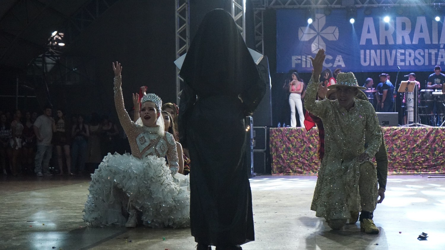 Entre os destaques da noite estiveram as apresentações das quadrilhas organizadas pelos próprios estudantes da FIMCA e da Faculdade Metropolitana, que encantaram o público com coreografias vibrantes e figurinos temáticos. Uma banda de forró formada por acadêmicos do curso de Música também se apresentou, mostrando o talento e a versatilidade dos alunos da instituição. Encerrando a noite com chave de ouro, o cantor Gabriel Parada subiu ao palco como atração principal e animou o público com um show contagiante que levantou todos do chão.